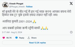 उन्होंने सोशल मीडिया पर एक पोस्ट में कहा “मेरे खिलाफ कुश्ती मैच में मैं हार गई। मुझे माफ़ कर दो। तुम्हारा सपना और मेरी हिम्मत – सब टूट गया है। अब मुझमें और ताकत नहीं है। अलविदा कुश्ती 2001-2024। मैं हमेशा आपकी ऋणी रहूंगी।”