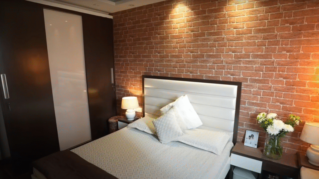 रोहित का बैडरूम एक स्टाइलिश रिट्रीट है। एक दीवार पर एक्सपोज़्ड रेड ब्रिक टेक्सचर है जो रॉ और अर्बन लुक देता है। इसके विपरीत, सफेद लग्ज़री बेडिंग और ब्राइट बैकलिट हेडबोर्ड कमरे में सुकून और क्लास का अहसास लाते हैं।