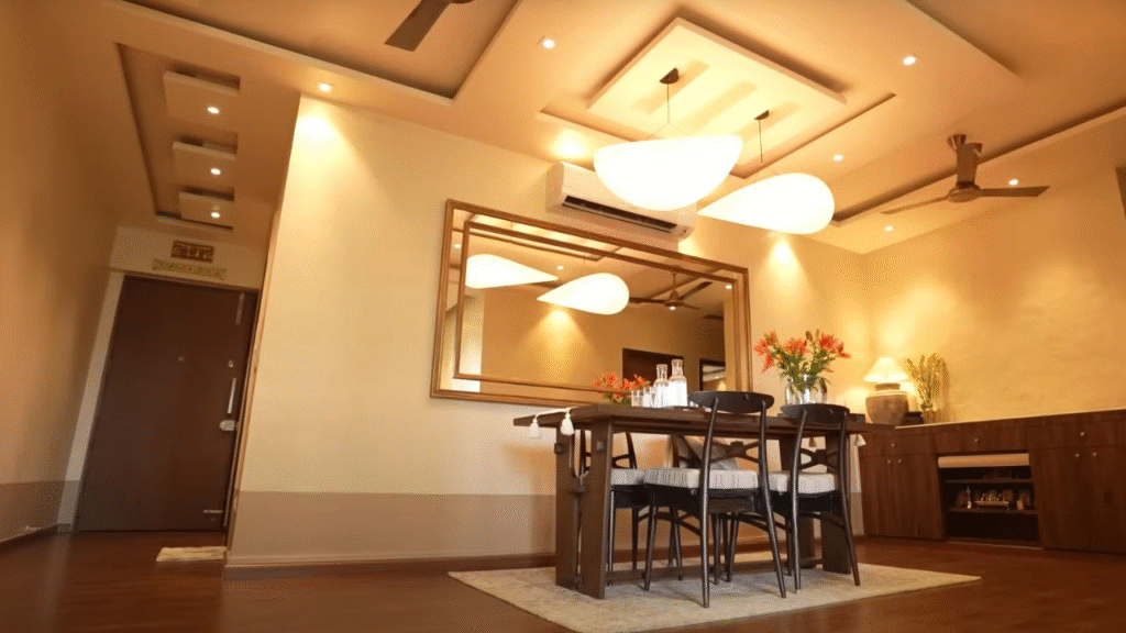 डाइनिंग एरिया में एक क्लासिक डार्क वुड डाइनिंग सेट है, जिसके पीछे एक बड़ा गोल्ड-फ्रेम वाला शीशा है। यह ना सिर्फ स्पेस को बड़ा दिखाता है, बल्कि पूरे माहौल में लग्ज़री का तड़का लगाता है।