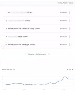 पीड़िता की पहचान का खुलासा न करने में मीडिया के विवेक के बावजूद, उसका नाम और अन्य व्यक्तिगत विवरण ऑनलाइन लीक हो गए। Google ट्रेंड डेटा पीड़िता से जुड़े शब्दों के लिए चिंताजनक खोज गतिविधि दिखाता है, जो गोपनीयता और शालीनता के घोर उल्लंघन का संकेत देता है।